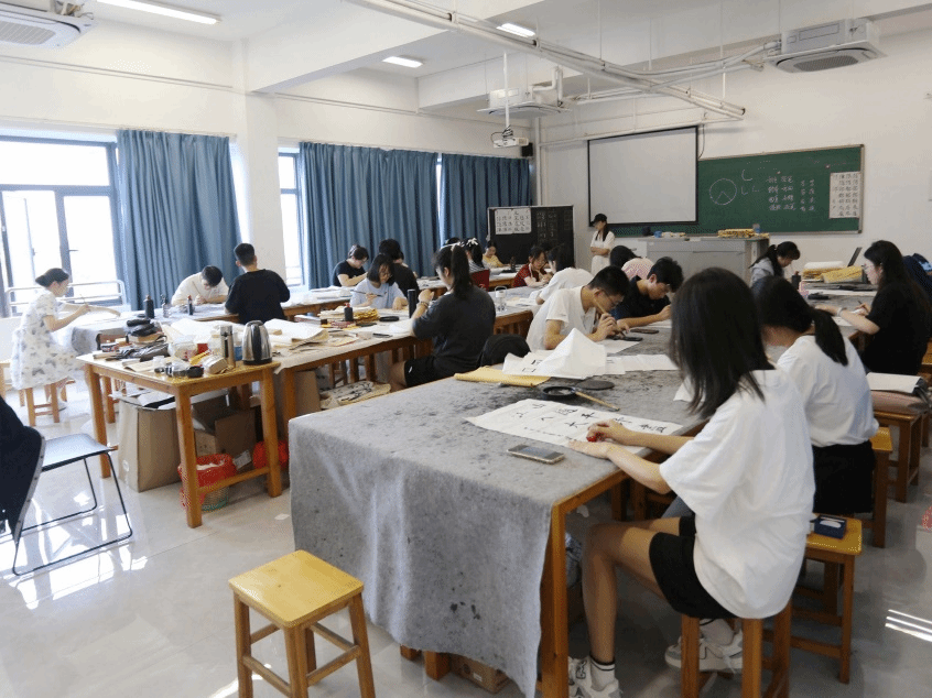 在软笔书写区域,同学们个个精神饱满,坐姿端正,下笔行云流水,展现出各具特色、笔法精妙的艺术风格。他们全神贯注,屏息凝神间,蘸墨、挥腕、转锋、提笔等一系列动作一气呵成,娴熟自如。林玉仁老师穿梭其中,不时驻足俯身,低语点拨,为同学们的作品增添几分章法和神韵。在老师的指导下,片刻间,一幅幅作品跃然纸上,或苍劲有力,或飘逸洒脱,令人赞叹不已。