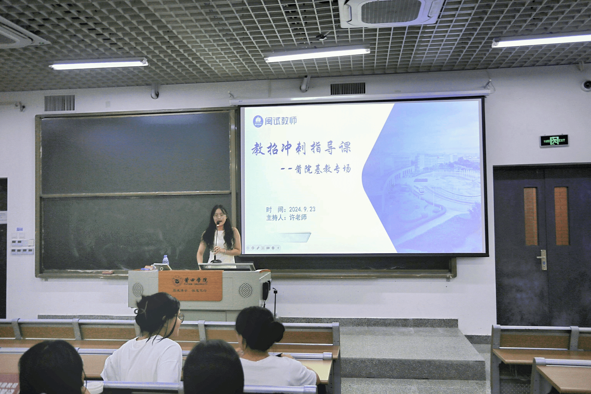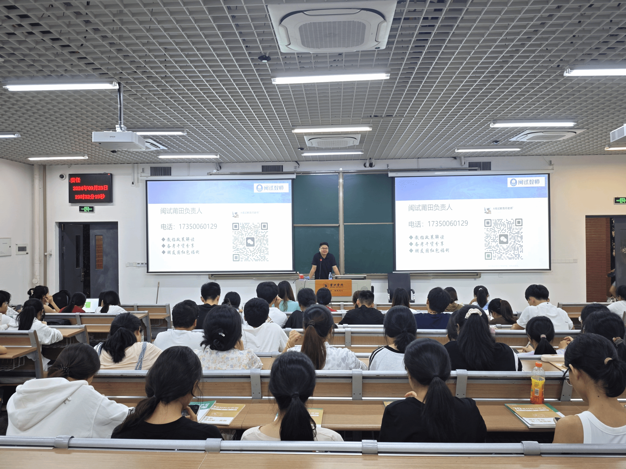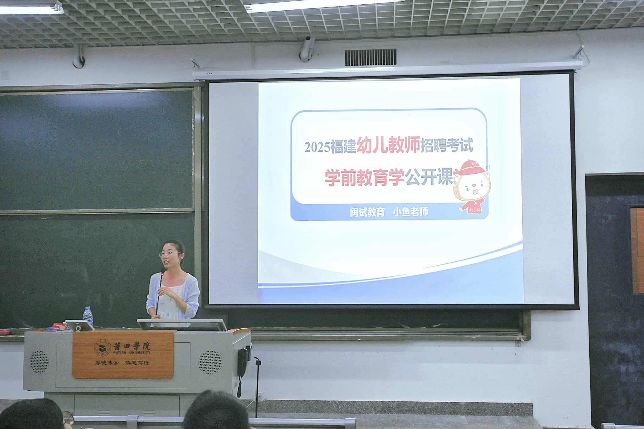 为帮助2023届、2024届学生了解近年来教师招聘考试的形势和要求,掌握基本备考技巧,提高毕业生参加教师招聘考试的应试能力和成功几率,促进毕业生实现高质量充分就业,9月23日晚上,莆田学院基础教育学院于中7明道楼举办2024年教师招聘备考指导讲座。本次讲座邀请了闽试教育教研中心主任、教招备考指导专家唐老师作为主讲人,共计200余名学生聆听了本次公开课。