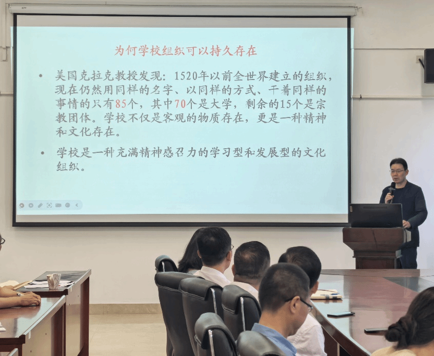 会上,吴刚教授围绕学校文化建设这一核心主题展开深入探讨。他以苏州大学等全国名校的例子为引入,生动阐释了文化对学校发展的关键作用。学校不仅是物质实体,更是充满精神感召力的文化组织。他强调,高质量学校发展必须基于学校的社会资源、智力资源和组织资源。此外,高质量学校发展也必须具备校长的领导能力、明确的发展愿景、专业的教师队伍、坚实的保障体系和有历史积淀的学校文化等构成要素。